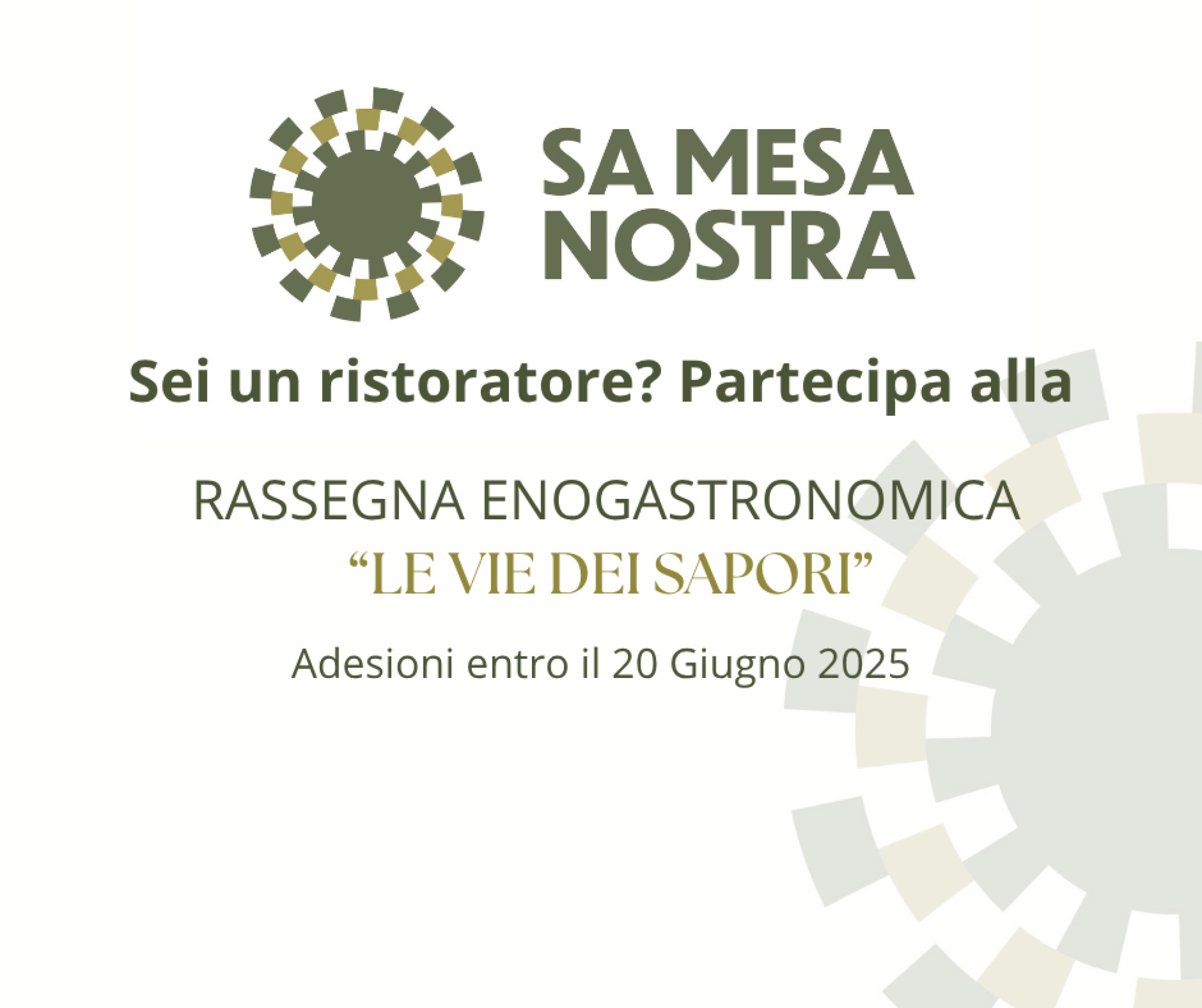 Il presente avviso è pubblicato per garantire massima trasparenza e pari opportunità di partecipazione a tutti gli operatori del settore interessati. TUTTI I RISTORANTI DELLA PROVINCIA DI ORISTANO SONO INVITATI A PARTECIPARE. L’ADESIONE ALLA RASSEGNA È GRATUITA.