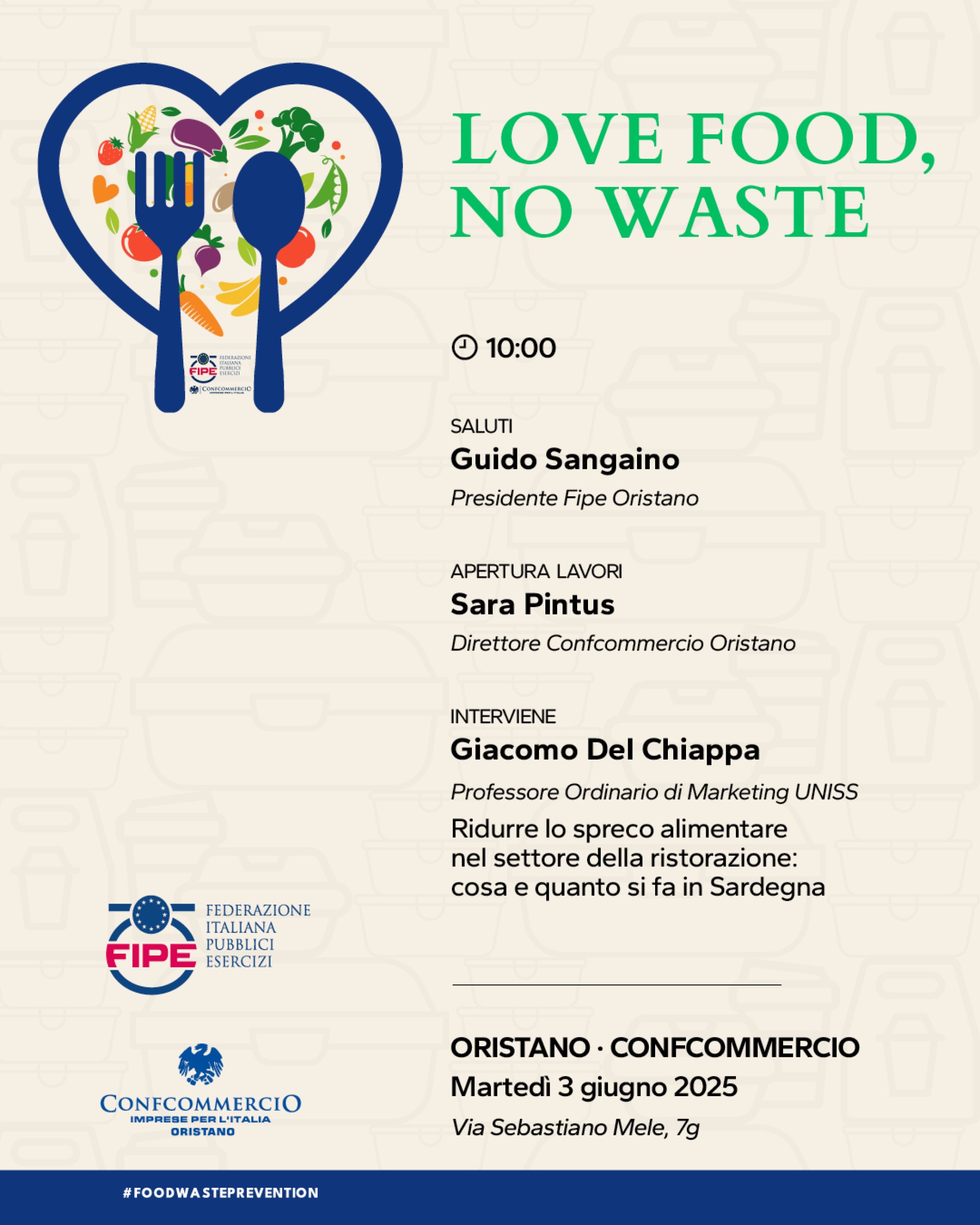 Martedì 3 giugno 2025, alle ore 10:00, presso la sede di Confcommercio Oristano (via Sebastiano Mele 7G), si terrà l’atteso seminario conclusivo del progetto “Love Food, No Waste”, promosso da Fipe Confcommercio.