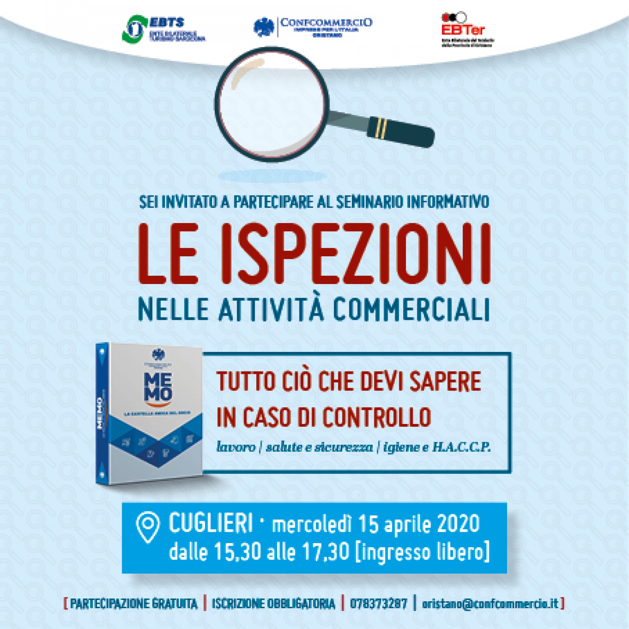 Prosegue a Cuglieri mercoledì 15 Aprile ore 15.30 il ciclo di seminari informativi dal titolo "Le Ispezioni nelle attività Commerciali - tutto ciò che devi sapere in caso di controllo".